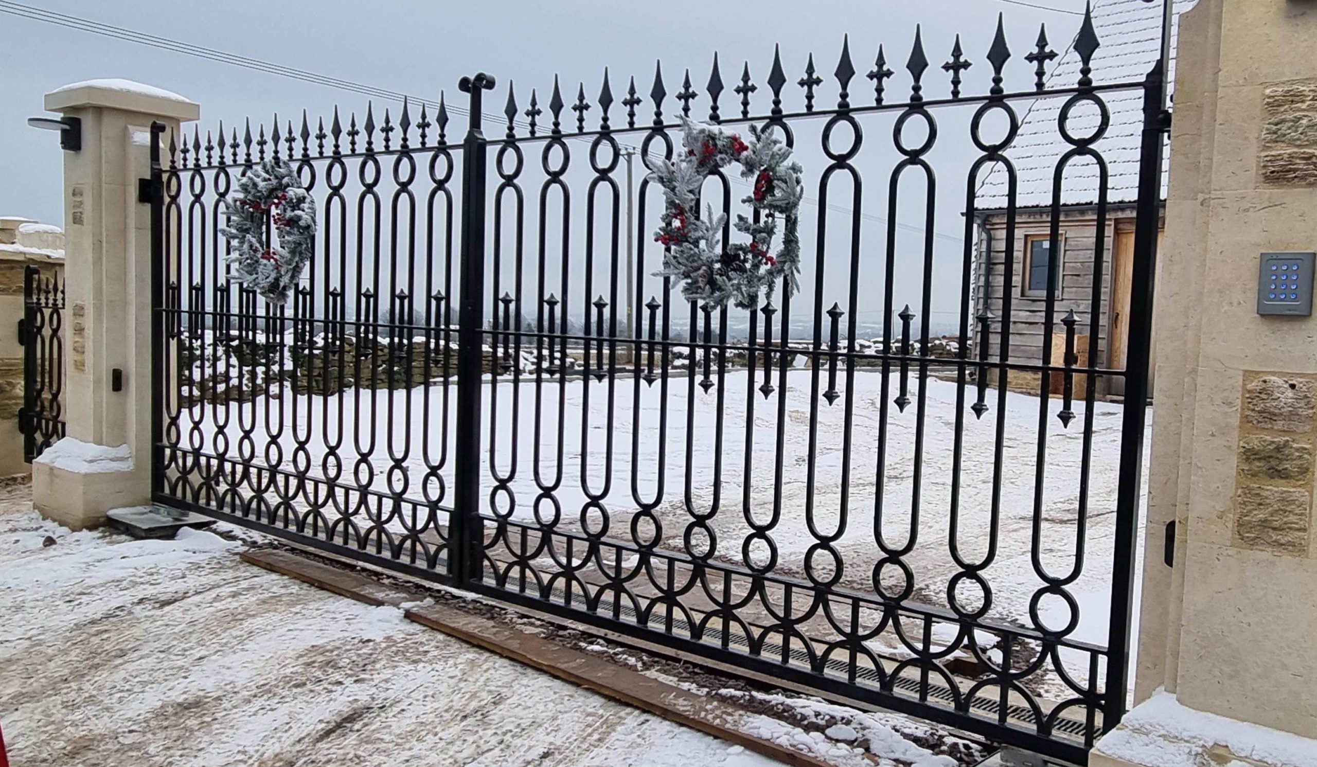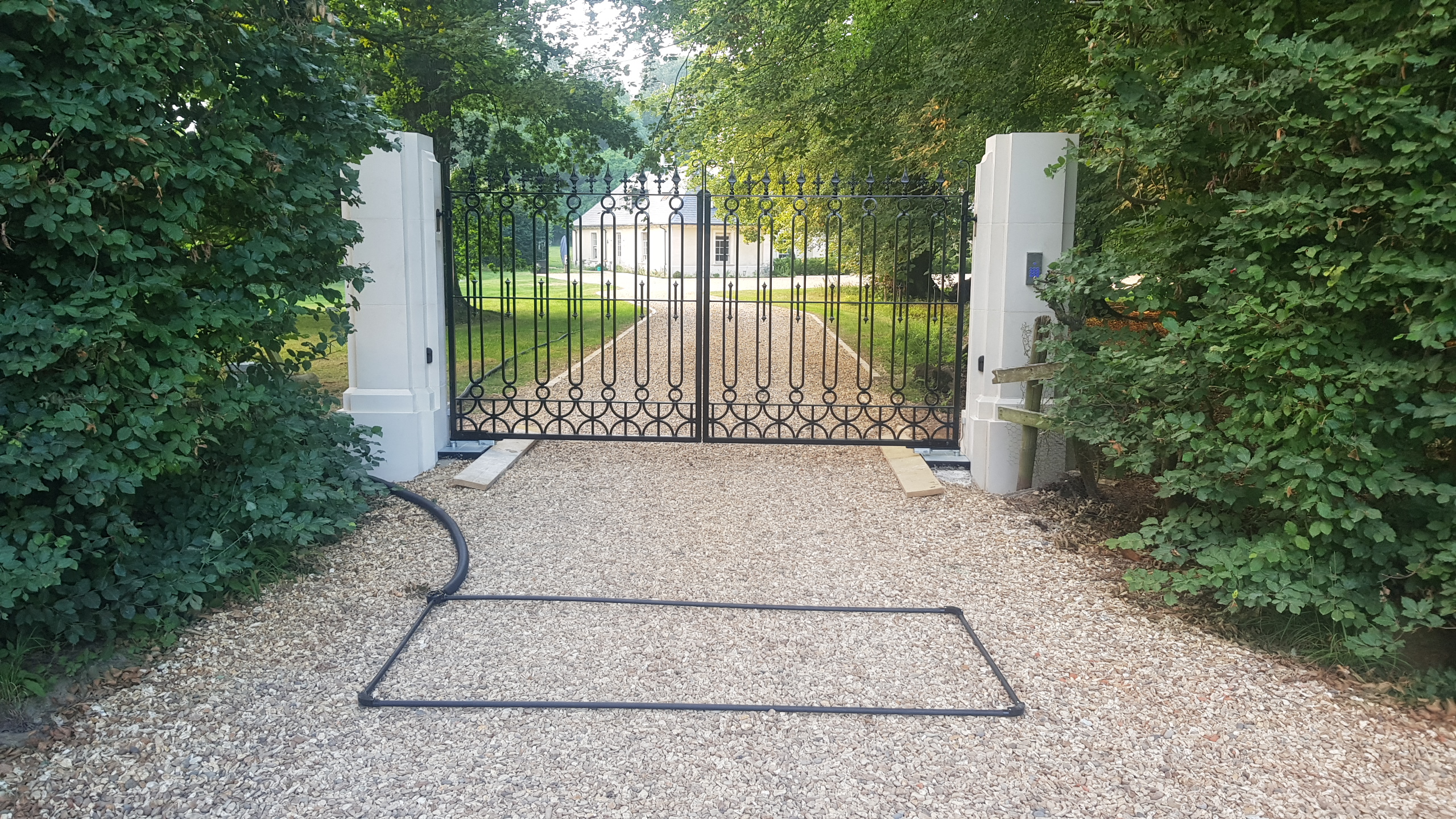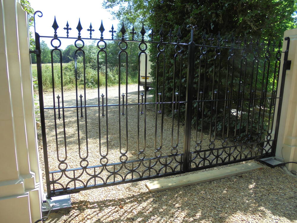 This driveway gate has a fresh look with shaped detailing evoking a "turn of the century" style . The design can be customised with a choice of finials and can be finished in any RAL colour. Made to measure to fit any gap width or height. These gates can be automated with above ground, below ground or sliding gate automation.