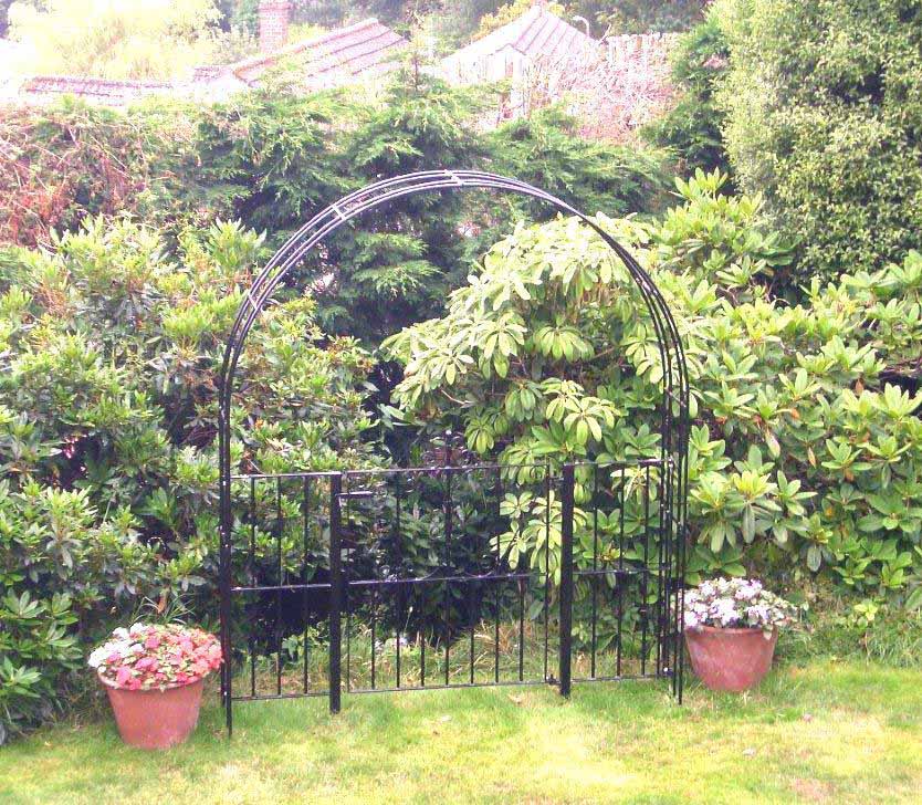 This splendid country style gated arch consists of a wide rose arch over a traditional garden gate that features magnificent scroll designs. The gate is attached to two posts with side panels that form an integral part of the arch, which gives a nice wide space to get pushchairs,wheelchairs and ride-on mowers through! The arch is strong and sturdy so can safely support the weight of climbing plants.