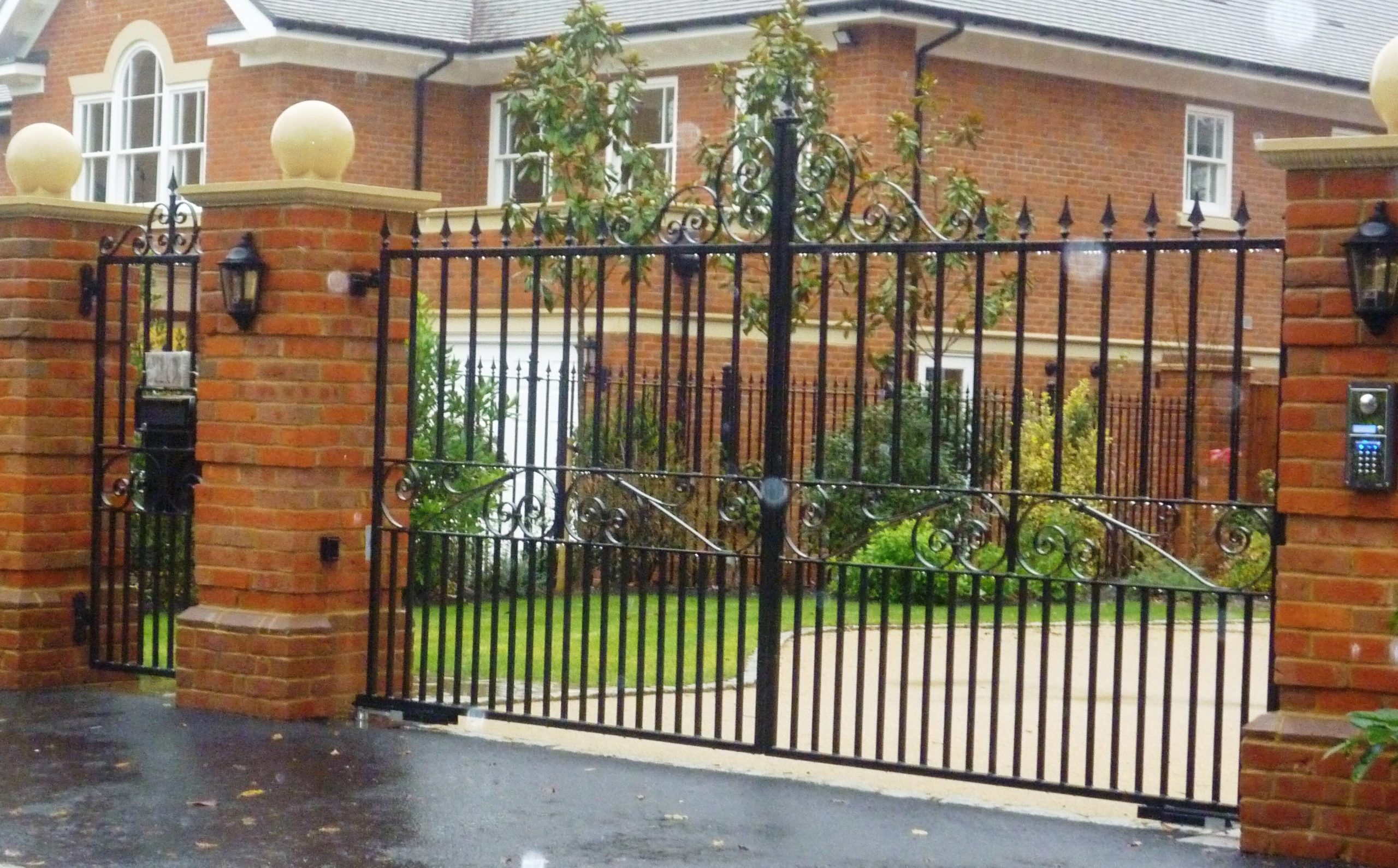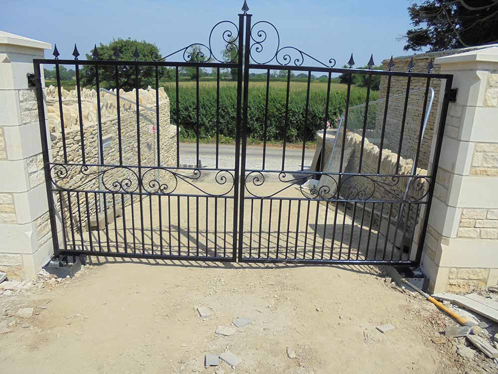 This impressive driveway gate features decorative scrolls on both the top and in the centre panel, substantial 20mm square or round uprights, and dog railings in the lower gate. You can customise the design with your choice of finials and finish. Made to measure to any gap width and height. Suitable for underground, above ground and sliding gate automation. Please contact us to discuss your design and for a guideline price.