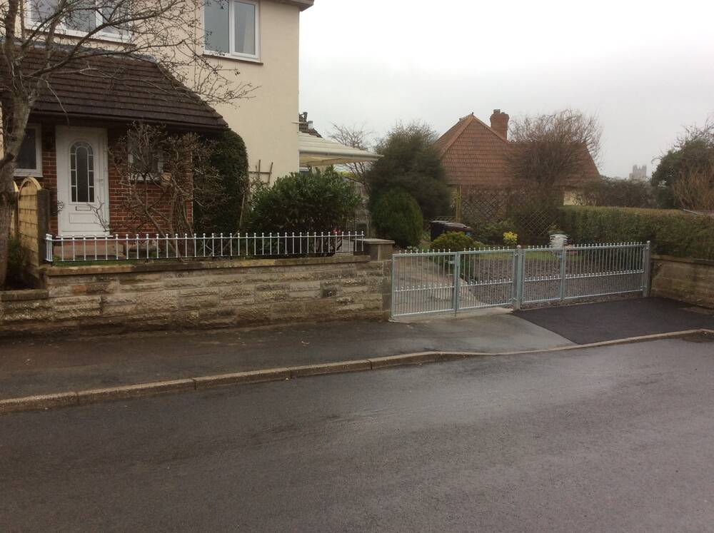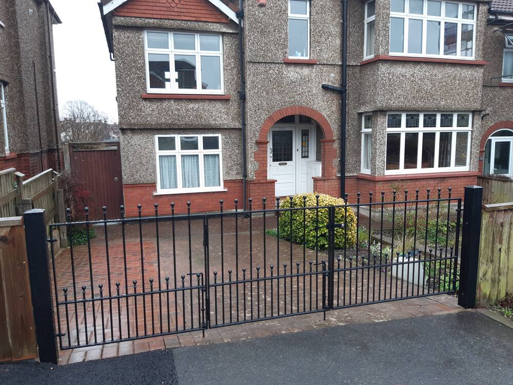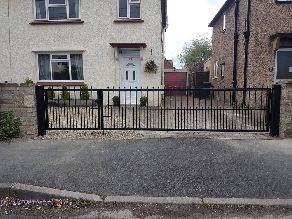 This contemporary design embraces style with simplicity. It features a row of finials along the top and above the dog railings in the lower section. The design can be customised with your choice of finials and RAL colour finish. The design can also be easily adapted into bi-fold gates. Please contact us to discuss your ideas and for a guideline price.